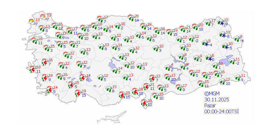 MGM tarafından yapılan son değerlendirmelere göre, ülkenin batı kesimlerinde parçalı ve yer yer çok bulutlu bir hava hakim olacak. Marmara, Ege, Akdeniz, İç Anadolu'nun büyük bölümü (Sivas hariç) ile Batı Karadeniz'de sağanak ve gök gürültülü sağanak yağışların etkili olması bekleniyor.