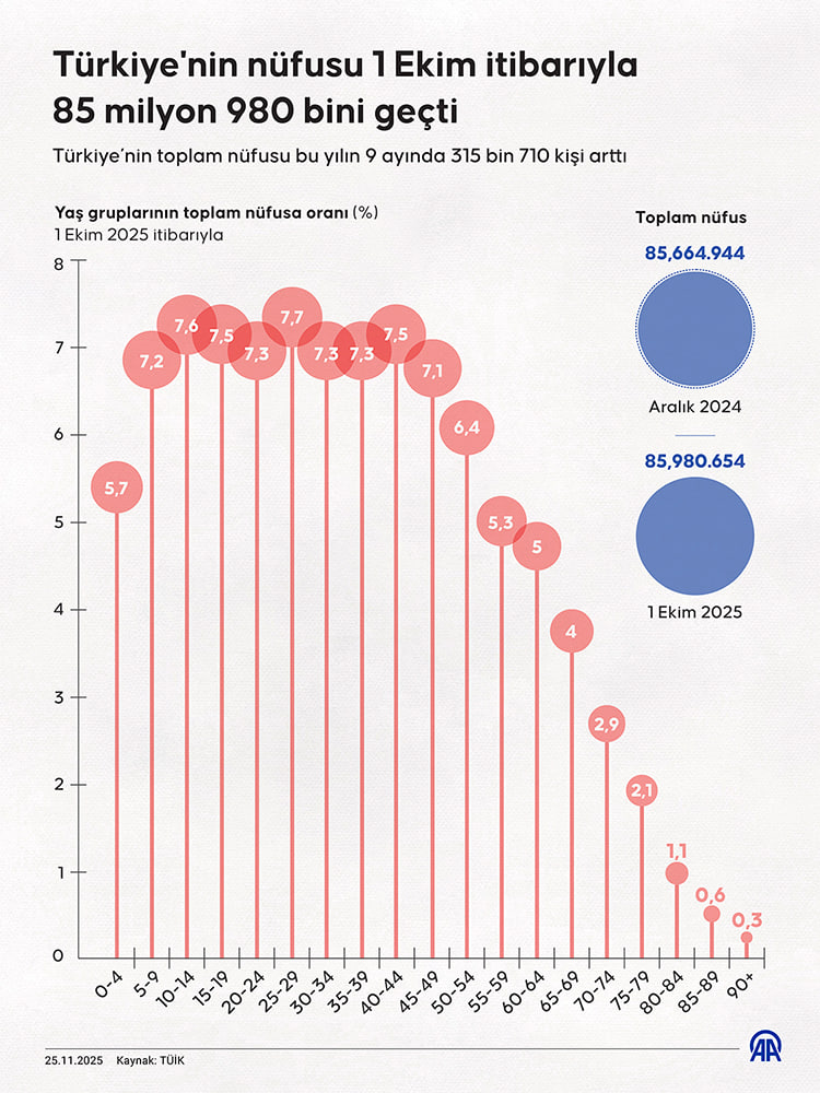 Üçer aylık dönemler esas alınarak hazırlanan resmi istatistiklere göre, Türkiye nüfusu, 2025 yılının ilk dokuz ayında toplam 315 bin 710 kişi arttı. Yılın üçüncü çeyreğini kapsayan 1 Temmuz-1 Ekim döneminde ise nüfus artışı 155 bin 800 kişi olarak kaydedildi.