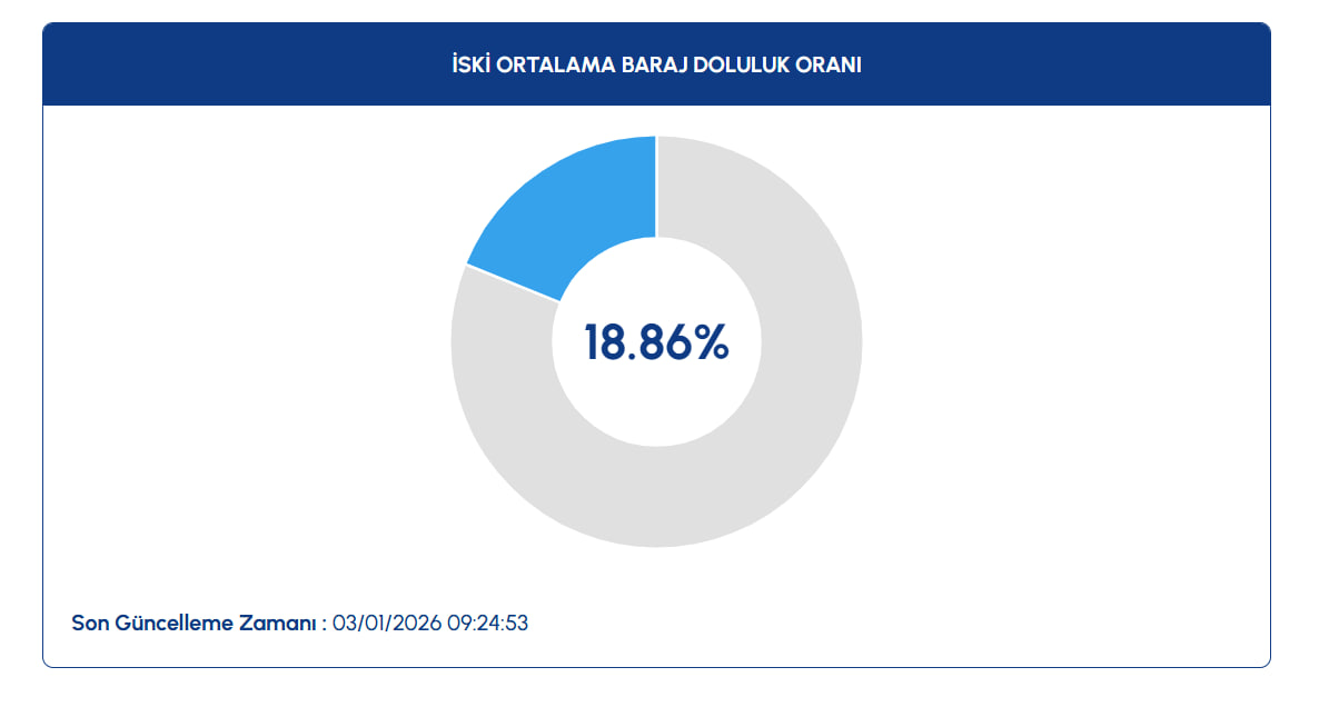 İSKİ'nin yayımladığı son verilere göre, İstanbul'daki barajların doluluk oranında artış kaydedildi. 3 Ocak itibarıyla kent genelindeki ortalama doluluk oranı yüzde 18,86 seviyesine ulaştı.