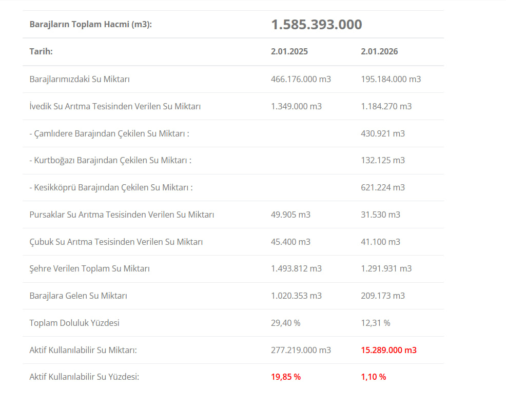 ASKİ tarafından yayımlanan 3 Ocak 2026 tarihli son verilere göre, Ankara'daki barajların toplam doluluk oranı yüzde 12,31 seviyesine kadar geriledi. Kentte kullanılabilir içme suyu miktarı ise yüzde 1,10 seviyesinde kayda geçti.