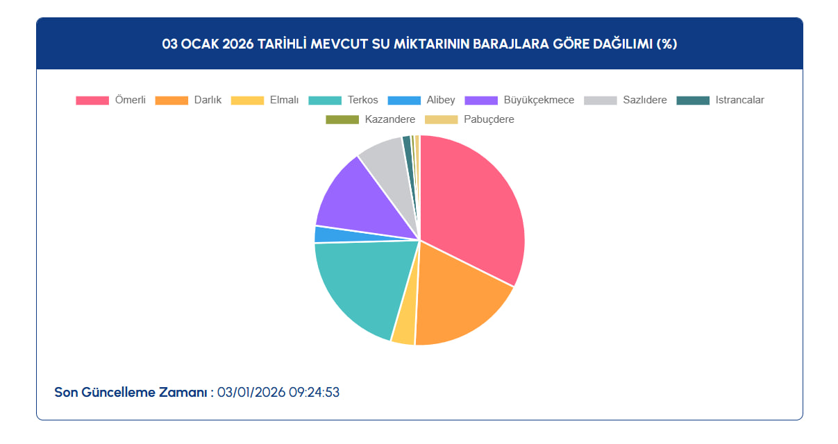 Etkili olan sağanakların ve kar yağışının ardından, su seviyelerindeki son durum merak konusu oldu. Milyonlarca kişi, resmi kurumlar tarafından açıklanan baraj doluluk oranlarını yakından takip ediyor. Peki 3 Ocak itibarıyla İstanbul, Ankara ve Bursa barajlarında son durum nasıl? İşte İSKİ, ASKİ ve BUSKİ'nin paylaştığı güncel baraj doluluk oranları…