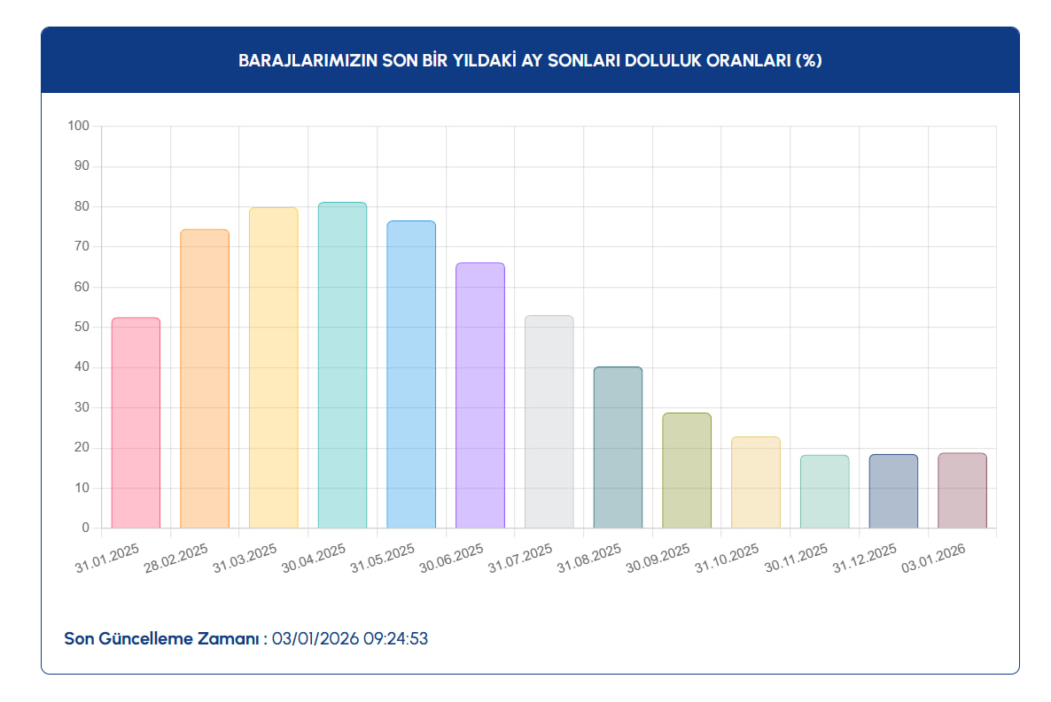 Yıl boyunca barajlarda dikkat çeken dalgalanmalar yaşandı. Aylık istatistiklere bakıldığında, 2025 yılı içinde en yüksek doluluk oranı nisan ayında yüzde 81,23, en düşük doluluk oranı ise kasım ayında yüzde 18,38 ile kaydedildi.