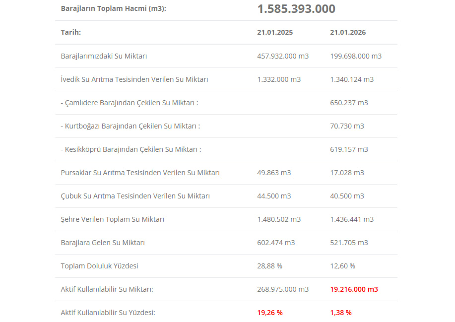 21 Ocak tarihli baraj dağılımında mevcut su miktarının en büyük payı Ömerli Barajı'nda %39,66 olarak kaydedilirken, Darlık %19,61 ve Terkos %14,7 ile öne çıktı. En düşük oranlar ise Kazandere %0,62 ve Istrancalar %0,88 olarak paylaşıldı. Megakentin su miktarının barajlara göre dağılımı şu şekilde açıklandı: