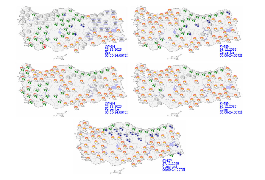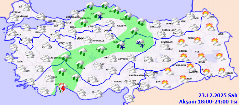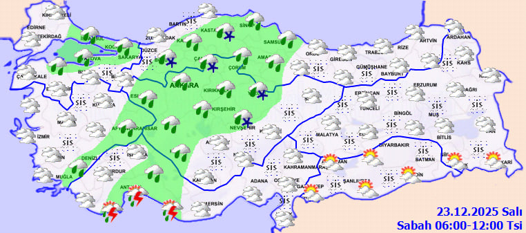 Yağışların büyük bölümünün yağmur ve sağanak şeklinde olması, Batı Akdeniz kıyılarında ise yer yer gök gürültülü sağanak görülmesi bekleniyor. Batı Karadeniz'in iç kesimleri ile İç Anadolu'nun kuzeydoğusunun yükseklerinde karla karışık yağmur ve yer yer kar ihtimali bulunuyor. Sabah ve gece saatlerinde Marmara ile iç ve doğu bölgelerde pus ve sis etkili olacak.