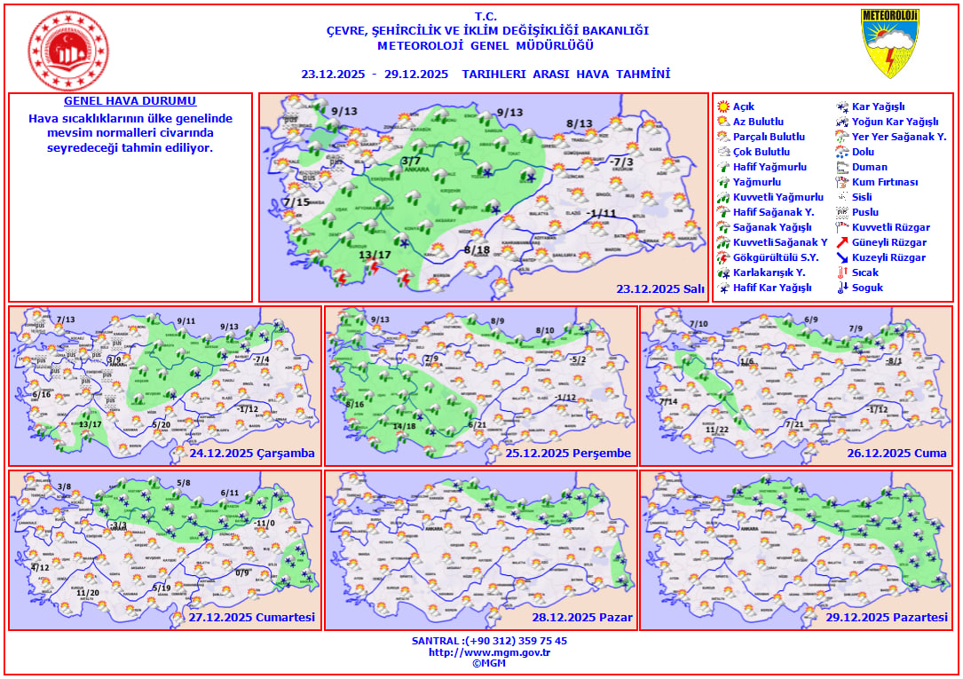 Hava sıcaklıklarının ülke genelinde mevsim normallerinin 1 ila 3 derece üzerinde seyretmesi bekleniyor. Rüzgârın ise genellikle güneyli yönlerden, kuzeybatı kesimlerde zaman zaman kuzeyli yönlerden hafif, yer yer orta kuvvette esmesi tahmin ediliyor.