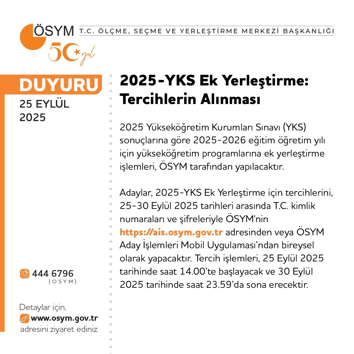 ÖSYM tarafından yapılan açıklamaya göre, 2025 YKS ek tercih süreci 25 Eylül saat 14.00 itibarıyla başladı. Yayınlanan ek tercih kılavuzu ile birlikte ön lisans (2 yıllık) ve lisans (4 yıllık) programlarda boş kontenjanlar adayların erişimine açıldı. Merak edilen konulardan biri de YKS başvuru ücreti oldu. Peki YKS ek tercih başvurularında kaç okul/bölüm tercih edilebilecek? İşte 2025 YKS ek yerleştirme sürecine dair merak edilenler…