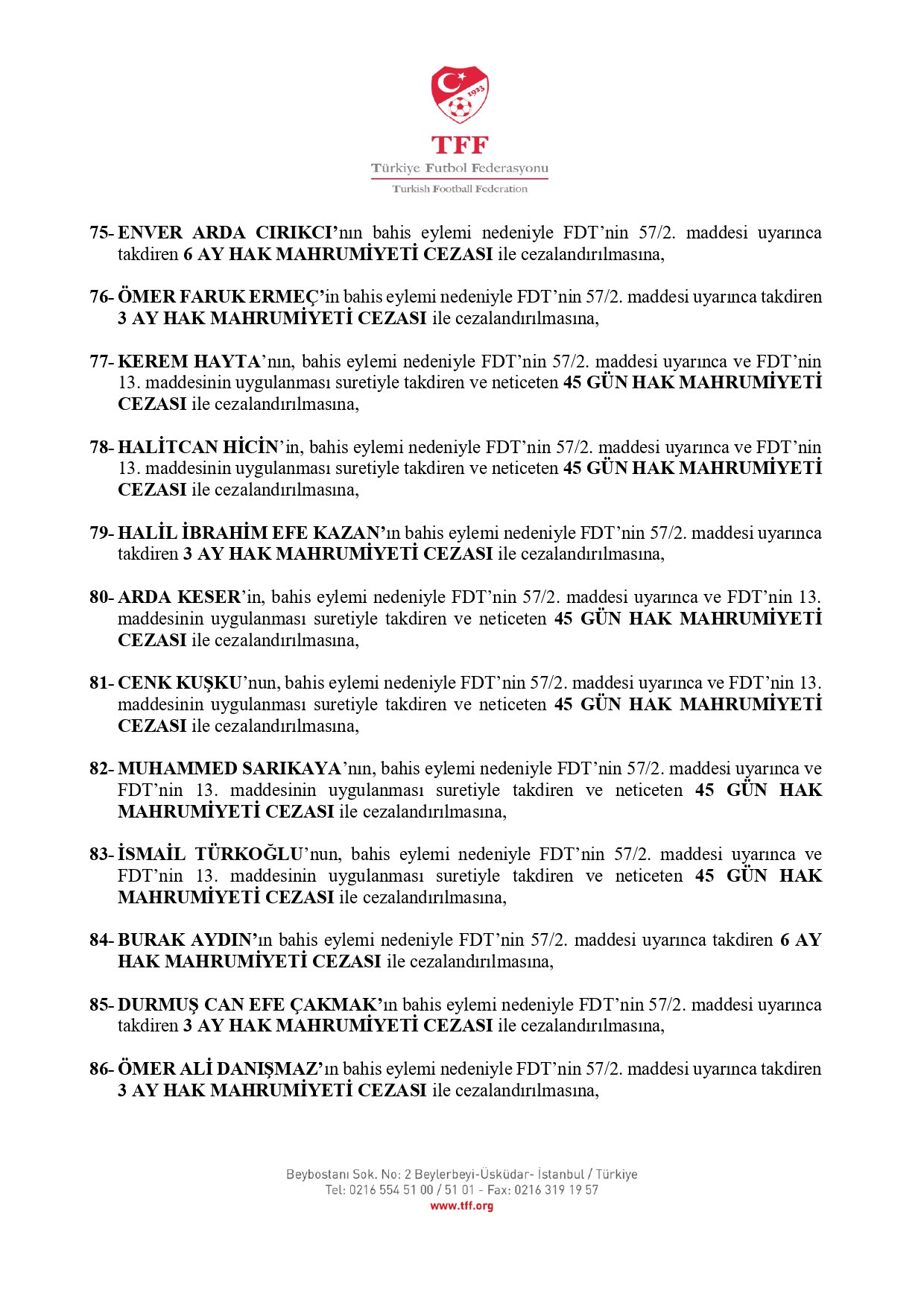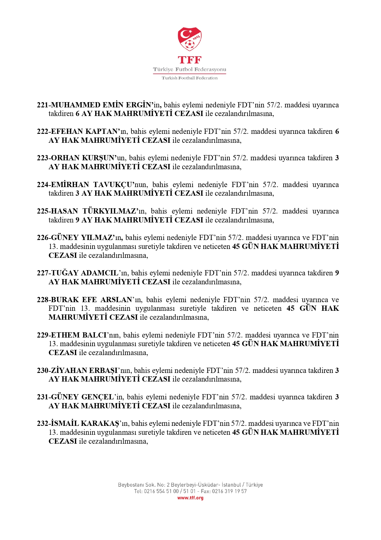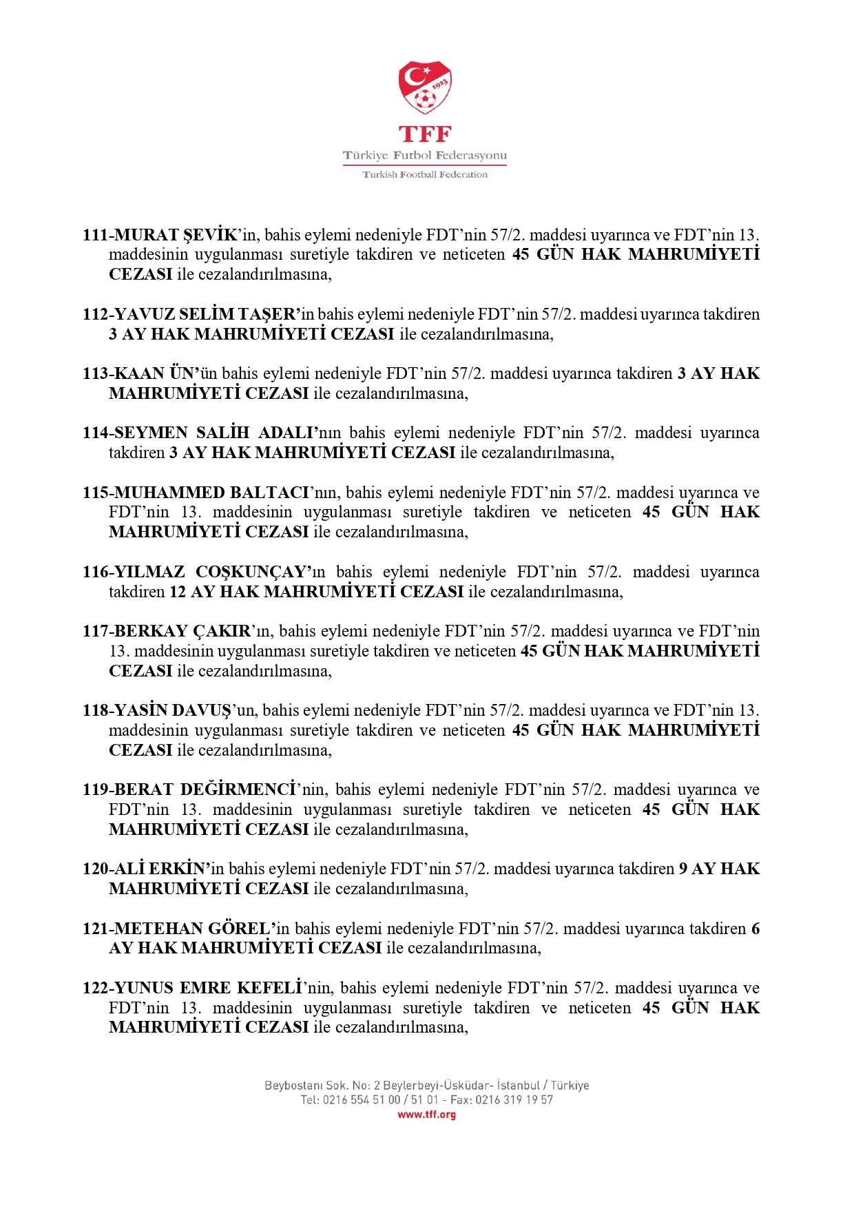 İŞTE CEZA ALAN OYUNCULARIN TAM LİSTESİ