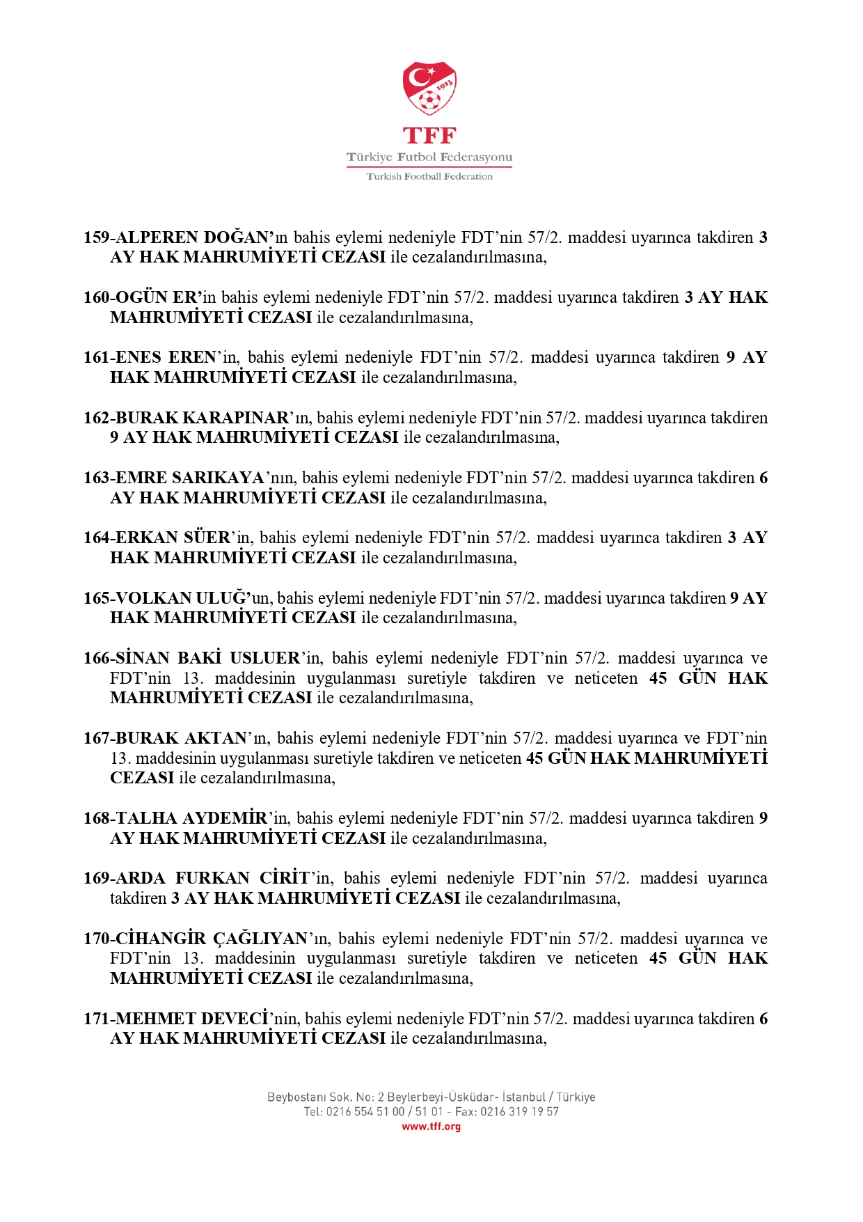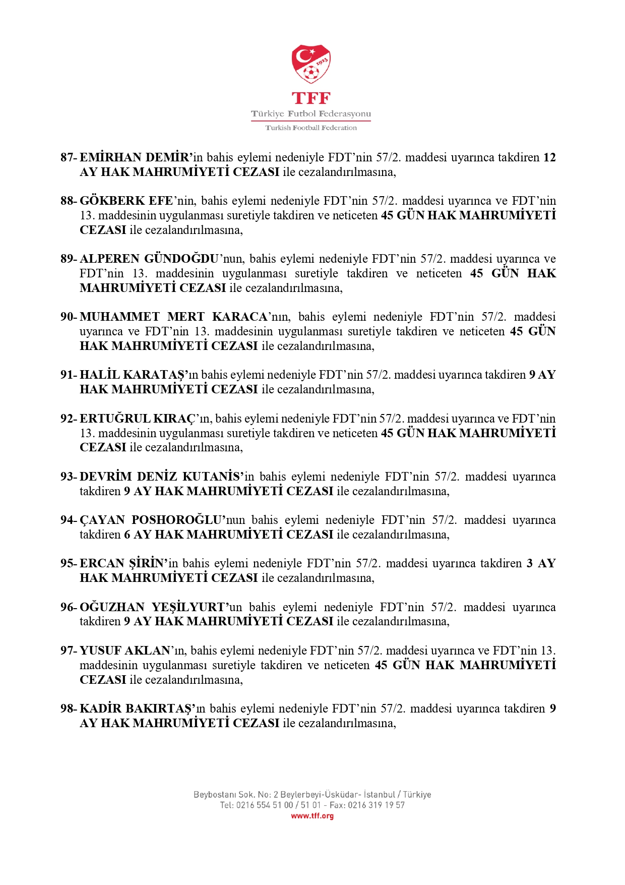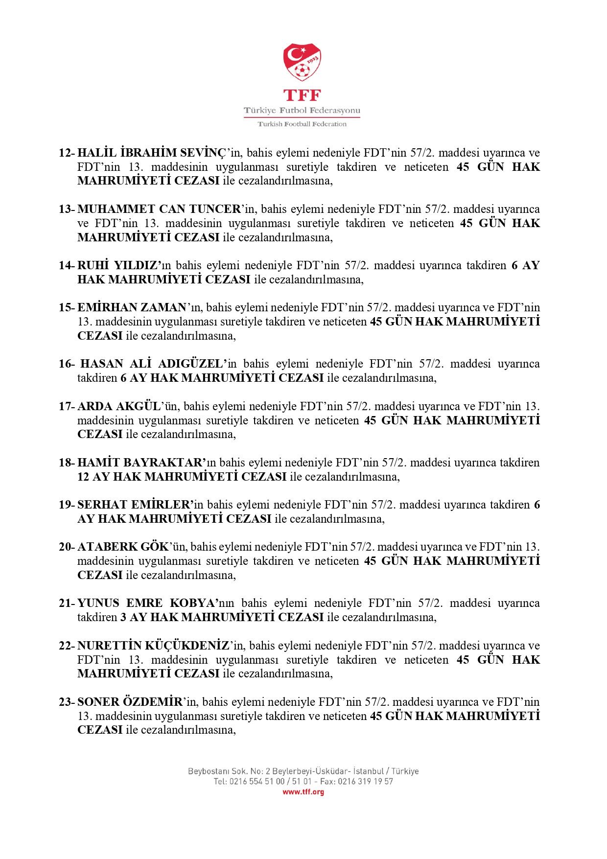 İŞTE CEZA ALAN OYUNCULARIN TAM LİSTESİ