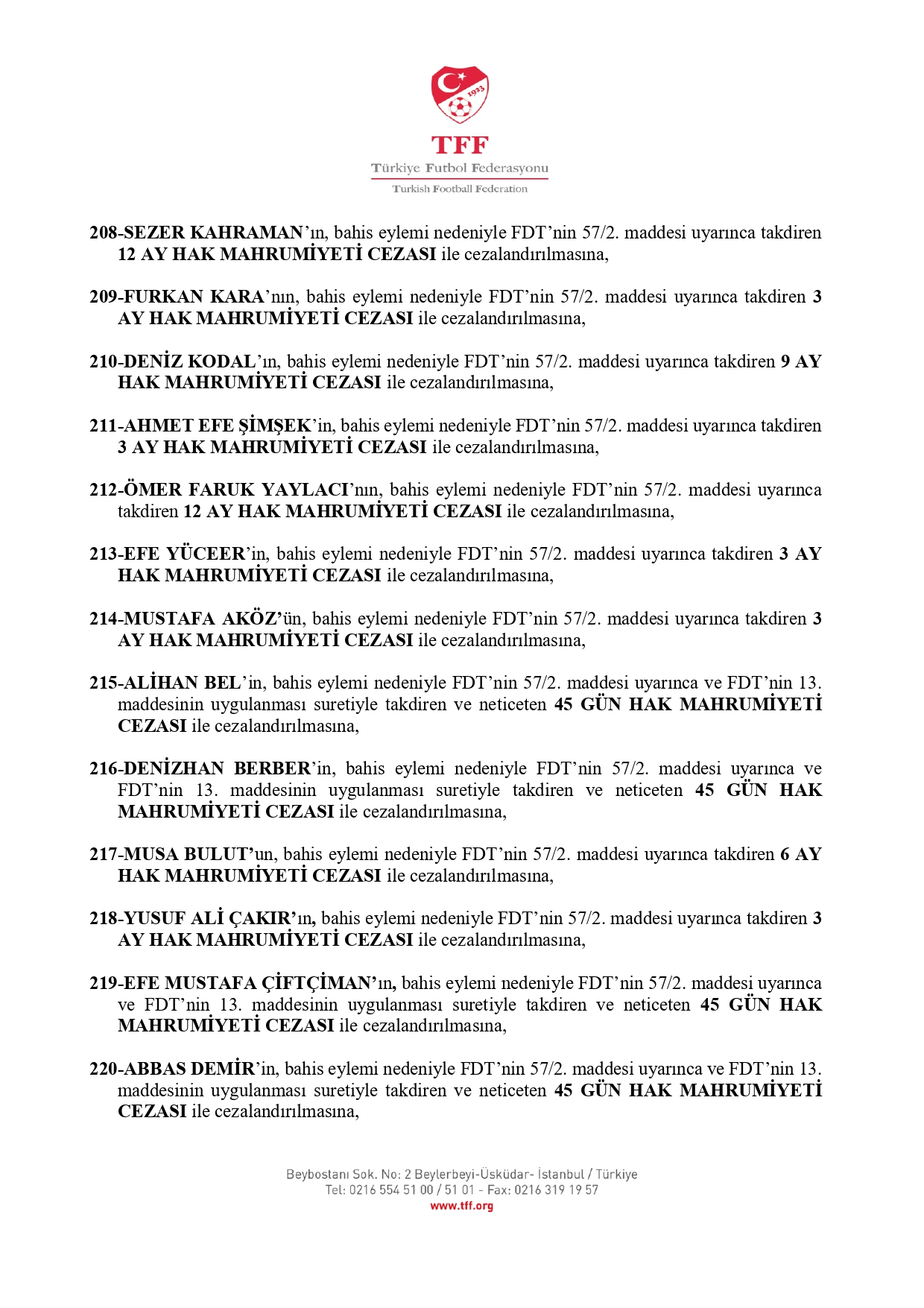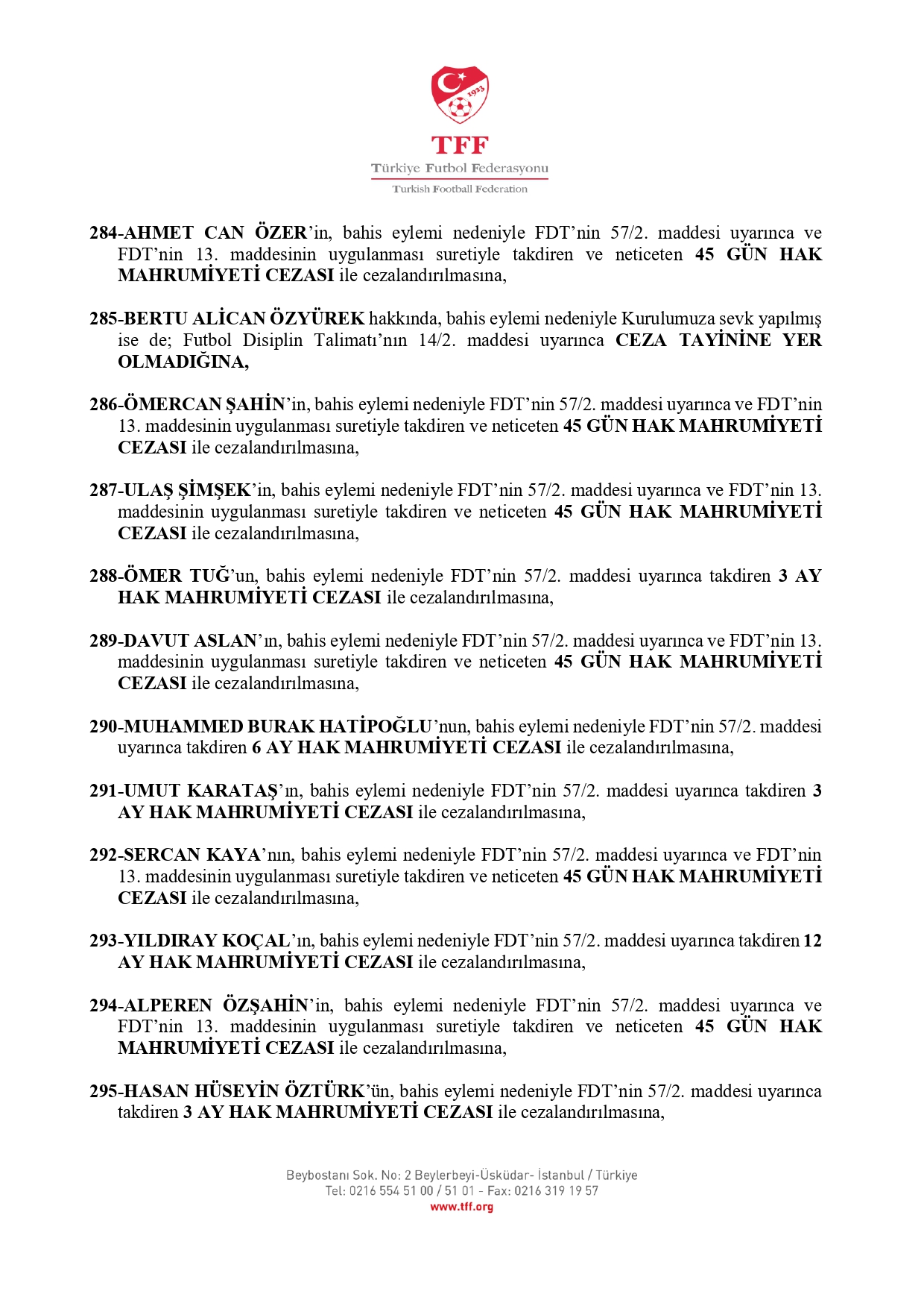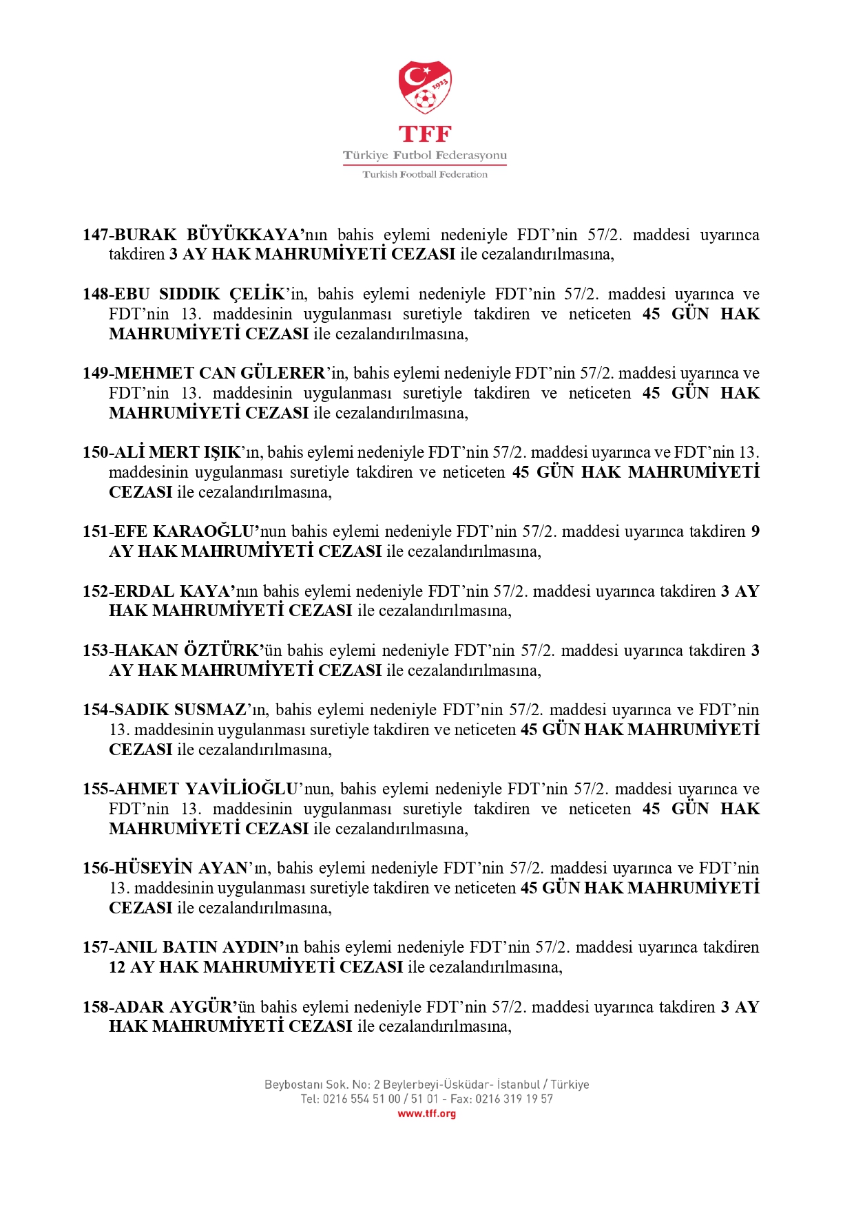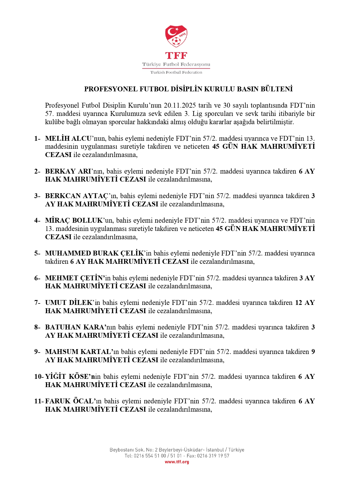 Böylece 10 Kasım'da PFDK'ye sevk edilen 1024 oyuncudan 1020'siyle ilgili cezalar açıklanmış oldu. Daha önce başka bir dosyadan 12 ay ceza alan Nesine 2. Lig oyuncusu Canberk Aydemir ve zaman aşımı nedeniyle Nesine 3. Lig'de forma giyen Bertu Alican Özyürek için herhangi bir müeyyide uygulanmadı.
