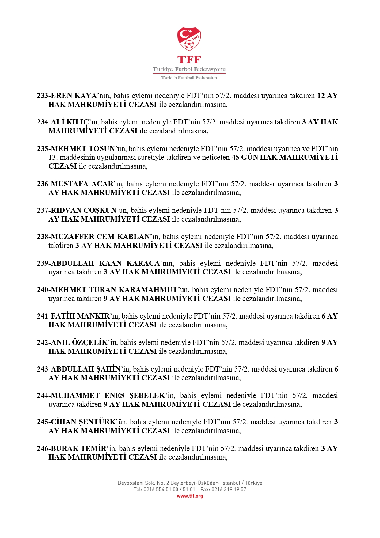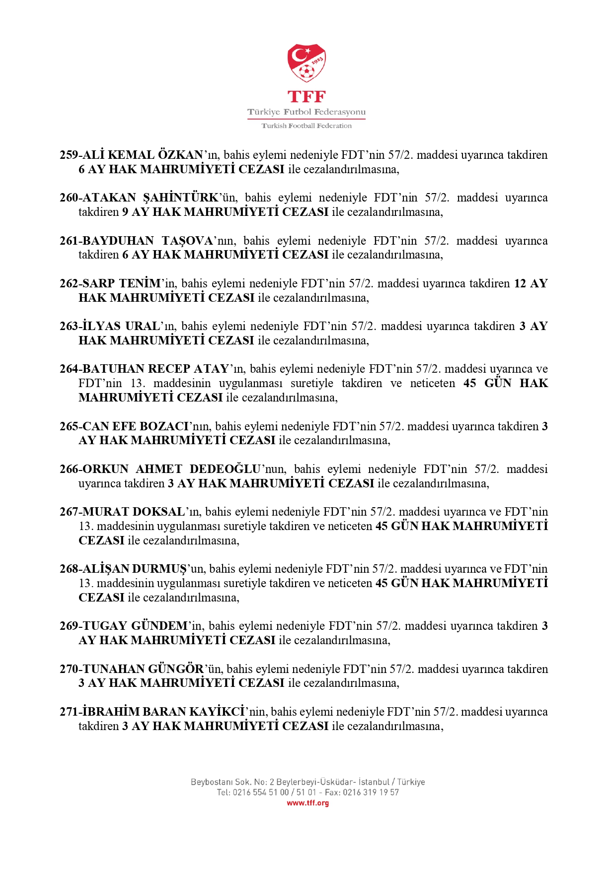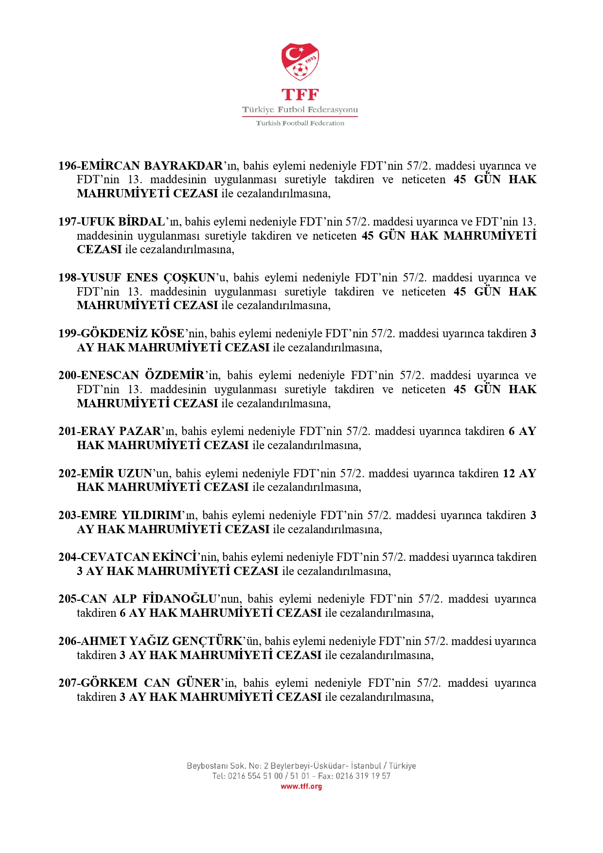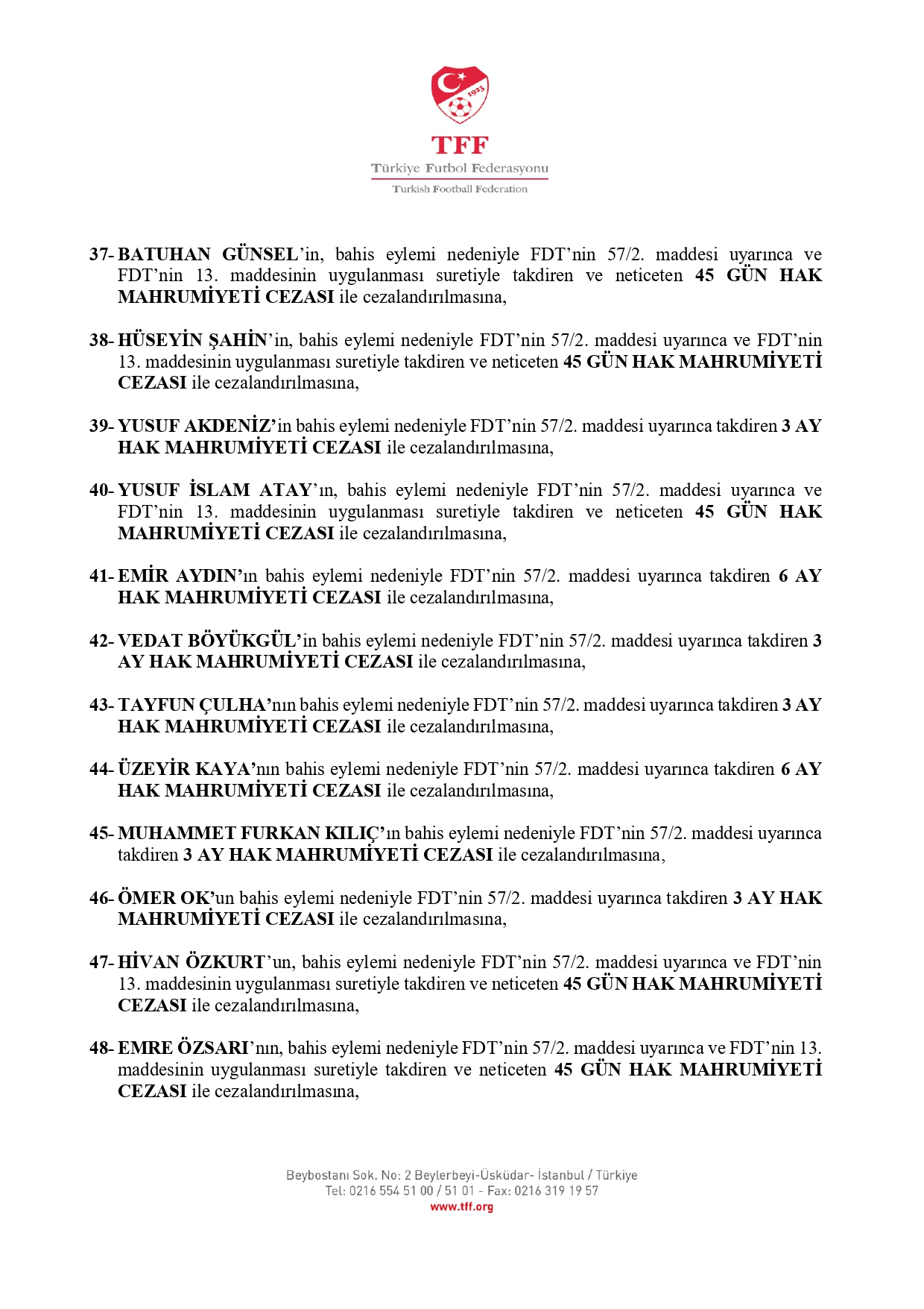 TFF'nin açıklamasına göre 3. Lig'den kurula sevk edilen 638 futbolcudan 637'si 45 gün ila 12 ay hak mahrumiyeti cezasına çarptırıldı.
