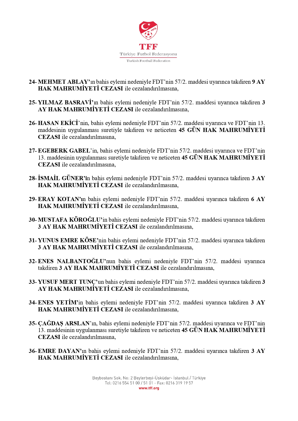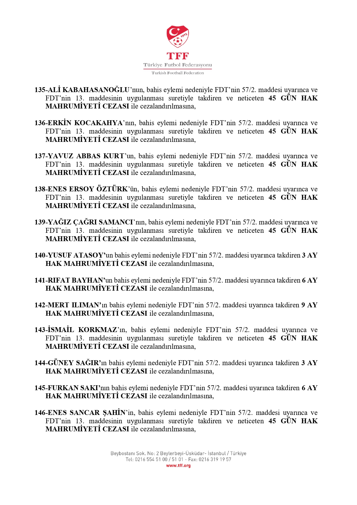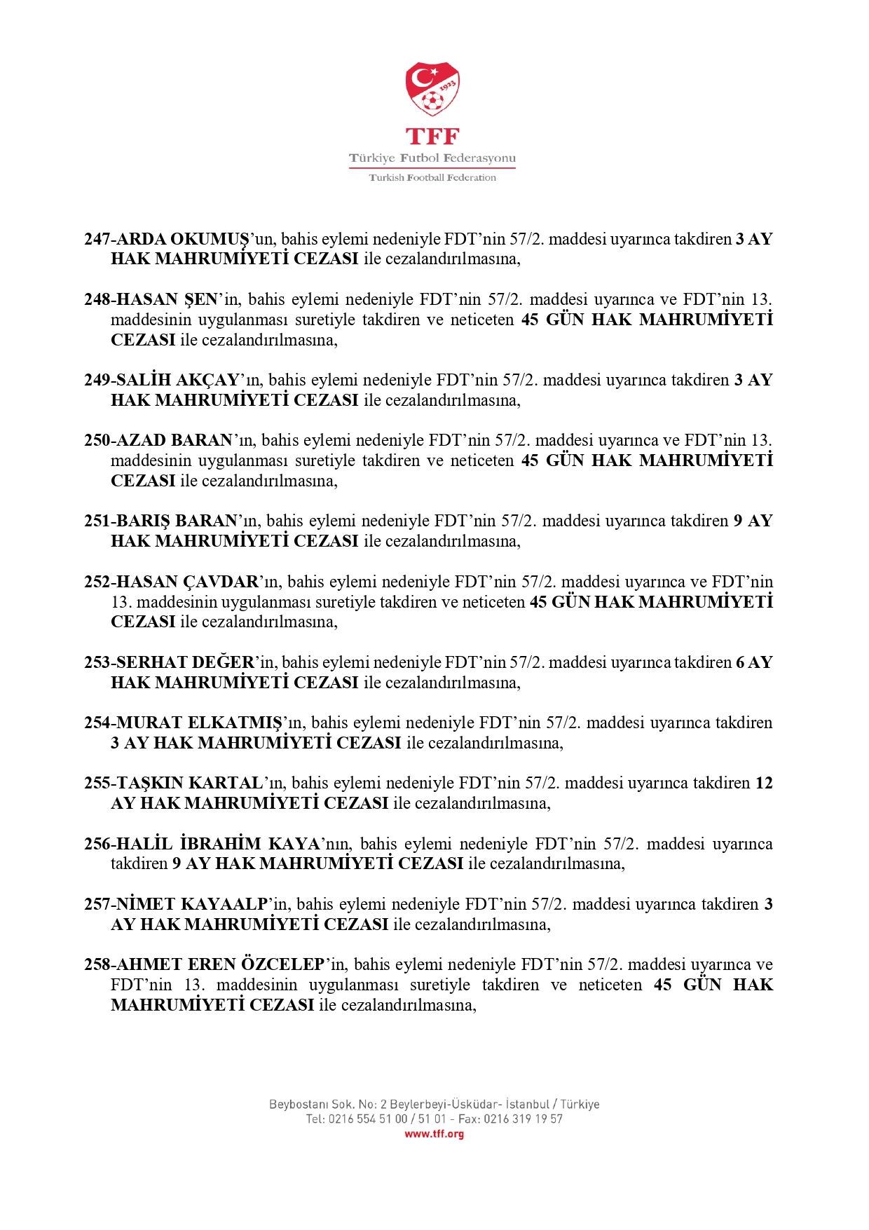 TFF'nin açıklamasına göre 3. Lig'den kurula sevk edilen 638 futbolcudan 637'si 45 gün ila 12 ay hak mahrumiyeti cezasına çarptırıldı.