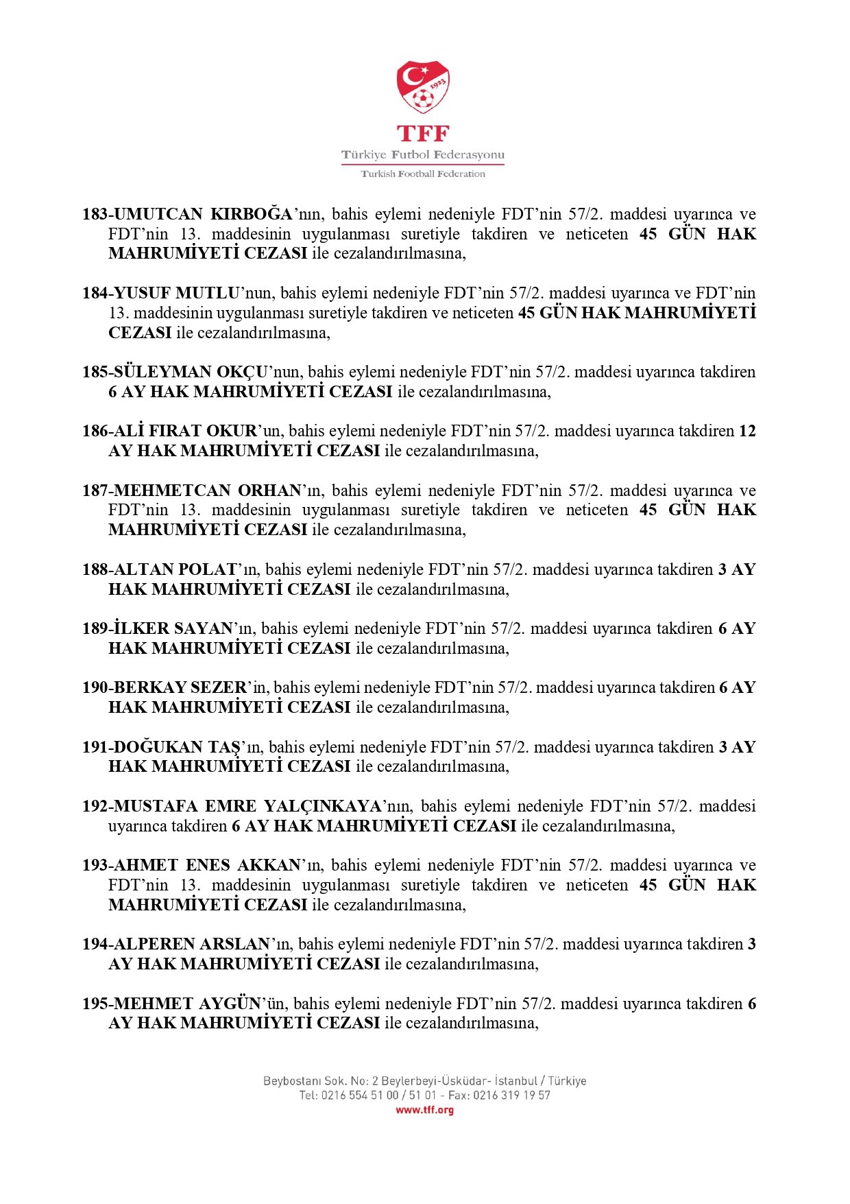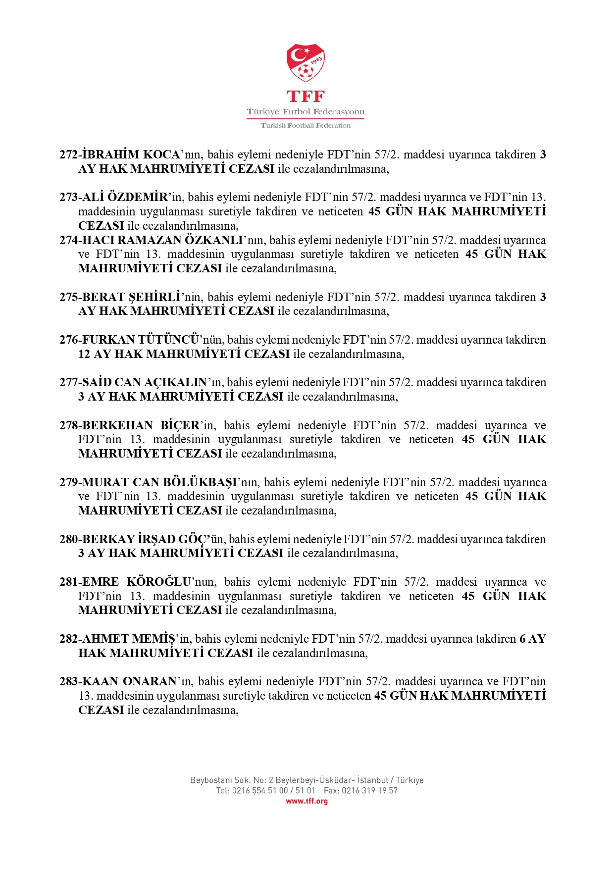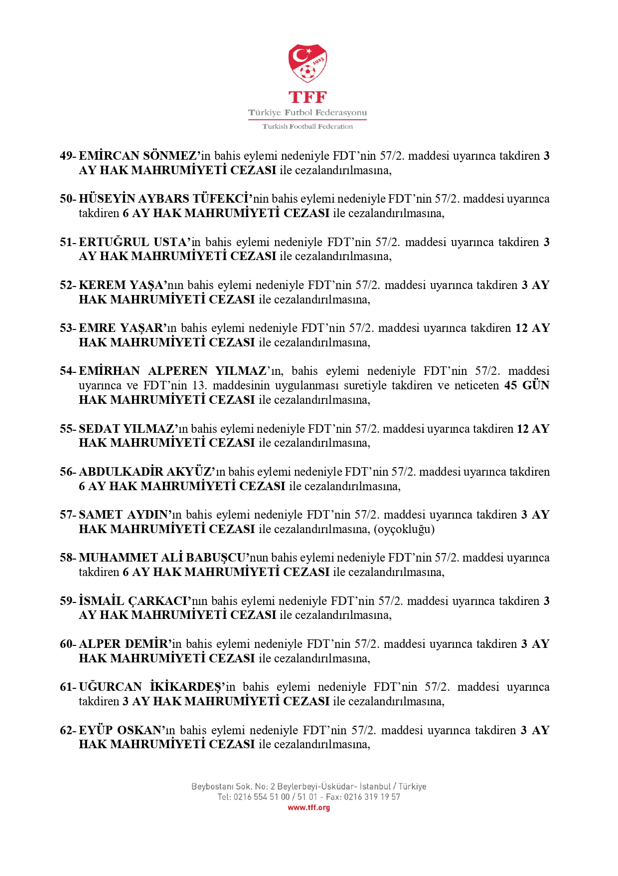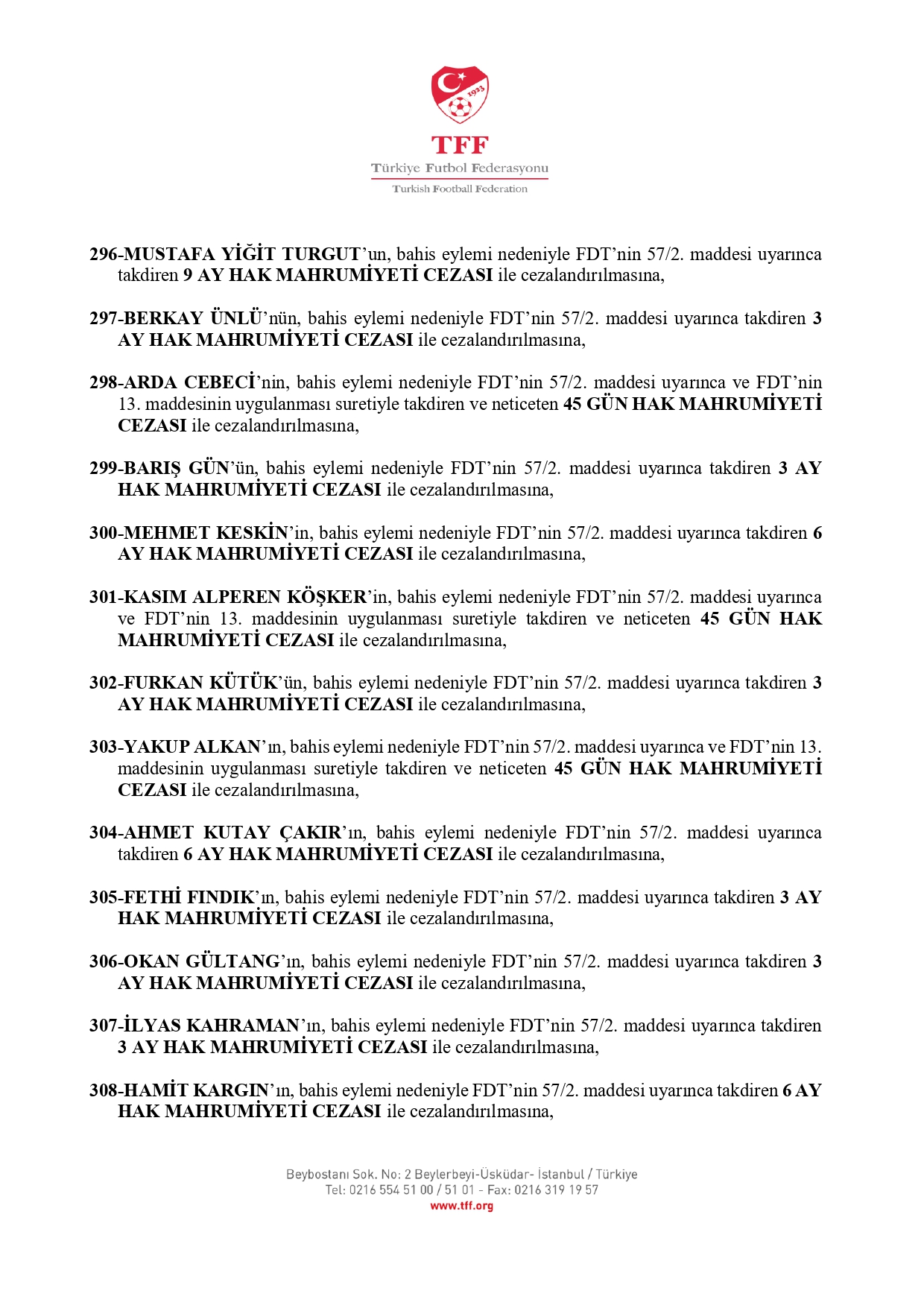 TFF'nin açıklamasına göre 3. Lig'den kurula sevk edilen 638 futbolcudan 637'si 45 gün ila 12 ay hak mahrumiyeti cezasına çarptırıldı.