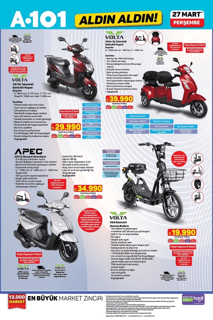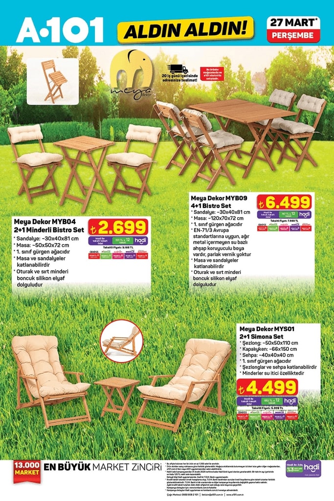 A101 27 Mart 2025 tarihli aktüel indirim kataloğunu yayınladı! Bayram alışverişini planlayan tüketiciler için cazip fırsatlar sunan katalogda, yaz aylarına özel bahçe mobilyalarından olta takımlarına, katlanır sandalyelerden elektrikli bisiklet ve mopedlere kadar birçok ürün yer alıyor. "Aldın Aldın" fırsatlarıyla dikkat çeken bu haftanın kampanyası perşembe günü A101 mağazalarında ve online platformda tüketicilerle buluşacak. İşte A101'in yeni indirimleri…