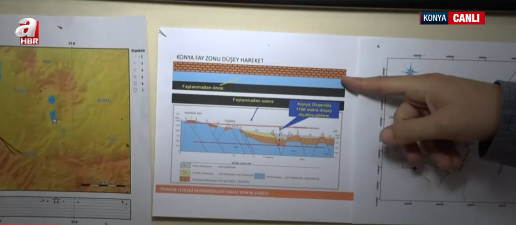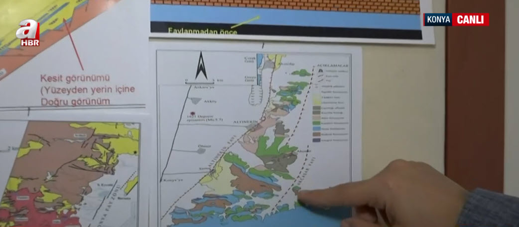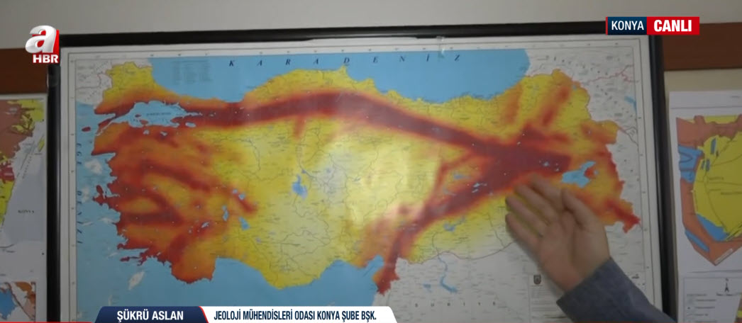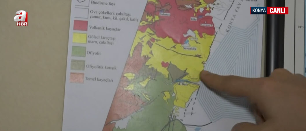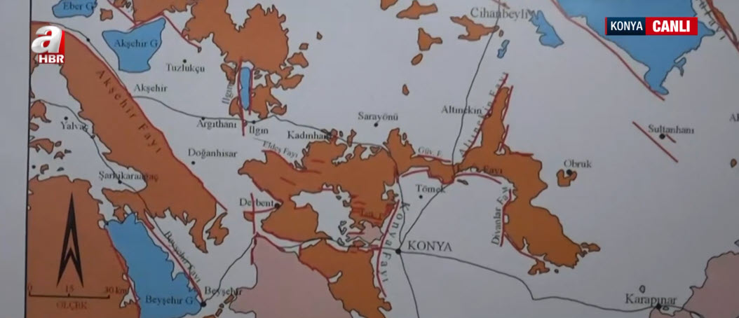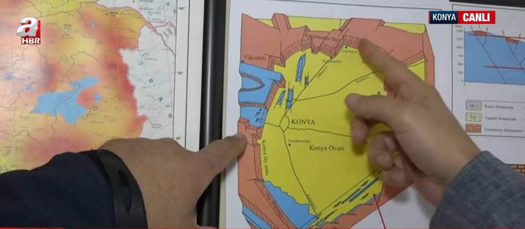 Konya'da sarı hatta koyu sarı dediğimiz çizgiler var. Konya'da aktif birçok fay var. Konya'ya baktığımız zaman aslında şöyle; Konya bir çöküntü havzası. Konya havzası oluşurken zaten fayların etrafında çökmesi sonucu oluşan bir havza.