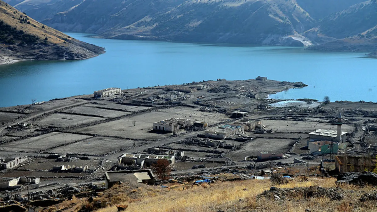 Kars'ın Sarıkamış ilçesindeki Karakurt HES Barajı'nda su seviyesinin düşmesiyle daha önce sular altında kalan köy evleri ve tarihi binalar tekrar gün yüzüne çıktı.