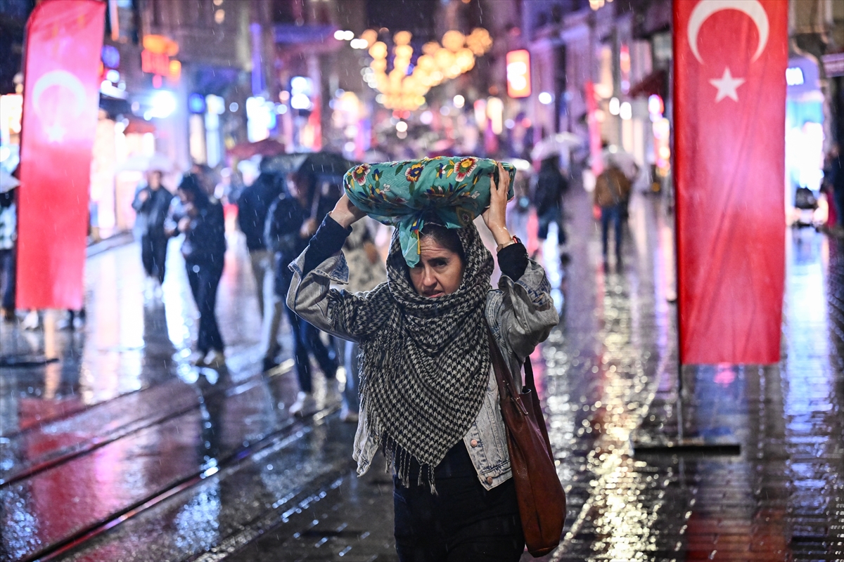 Kentin turistik bölgelerinden Taksim'de de etkili olan sağanağa hazırlıksız yakalananlar metro istasyonlarının çıkışlarında korunmaya çalıştı.
