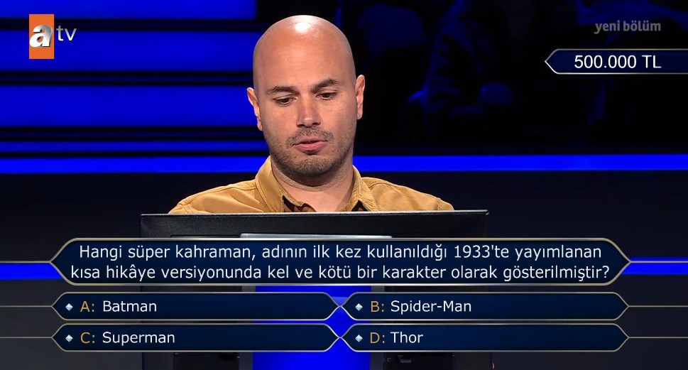 Ekranların en çok sevilen programı Kim Milyoner Olmak İster her hafta olduğu gibi bu hafta da milyonlarca izleyiciyi ekran başına kilitledi. Birbirinden eğlenceli yarışmacıların katıldığı programda bugün ise tam 500 bin TL'lik Süper Kahraman sorusu dikkat çekti. Akdeniz Üniversitesi Spor Yönetimi Bölümü mezunu 36 yaşındaki engelli yarışmacı Önder Yurdagül 300 bin TL'lik soruyu doğru yanıtladıktan sonra 500 bin TL'lik sorunun kilidini açmayı başardı. Tüm jokerlerini kullanan yarışmacının soruya yanıtı milyonları ekranlara kilitledi.