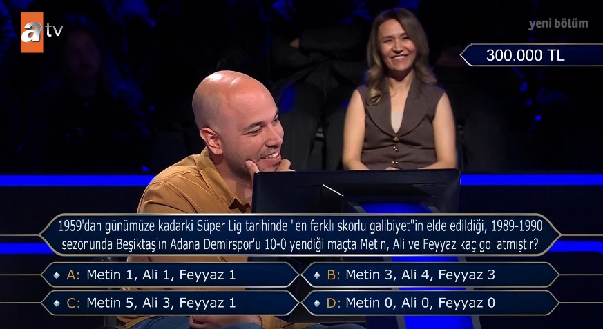 Bu aşamaya kadar tüm joker haklarını da tüketen yarışmacı, risk almak istemedi. Yurdagül, Soruyu görmesine rağmen yarışmadan çekilme kararı aldı ve 300 bin TL'lik para ödülünün sahibi oldu.