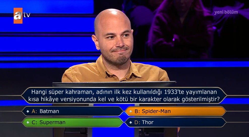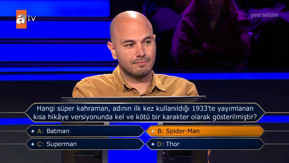 Sunucu Oktay Kaynarca, yarışmadan çekilme kararı alan yarışmacıya, "Cevap vermek zorunda olsaydınız hangi şıkkı seçerdiniz?" diye sordu. Yarışmacı, "B- Spider-Man" yanıtını verdi.