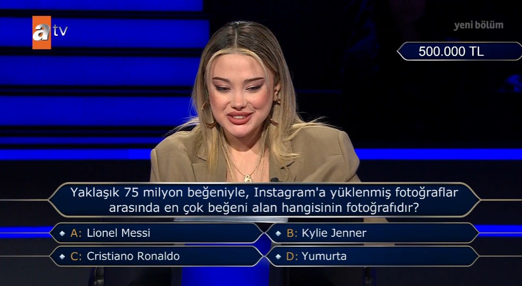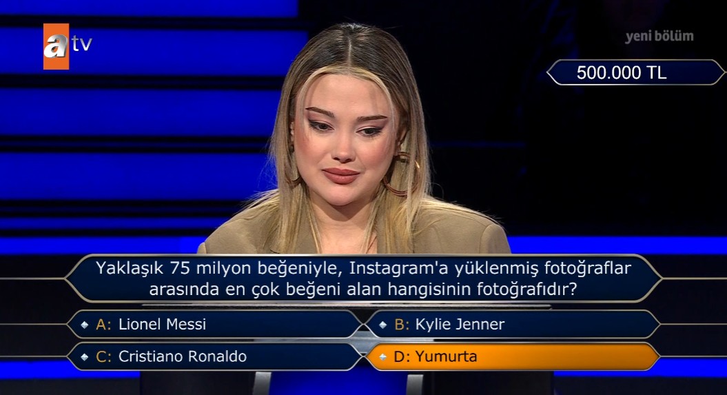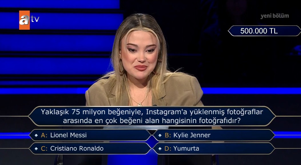 ATV'nin yıllardır en çok izlenen bilgi yarışması Kim Milyoner Olmak İster her perşembe ve pazar akşamı olduğunu gibi birbirinden ilginç sorularıyla hem eğlendirirken hem de düşündüren anlara sahne oldu. Sevilen yarışmada Büşra Aydın isimli yarışmacı, 500 bin TL değerindeki sorunun kilidini açarken karşısına çıkan soruda cevabını bildiğini ifade ederek hayatının hatasını yaptı. Üniversite öğrencisi Instagram sorusuna verdiği yanıt yanlış çıkmasıyla büyük hayal kırıklığına uğrarken o anlar sosyal medyada oldukça konuşuldu. İşte Kim Milyoner Olmak İster'de yaşananlar...