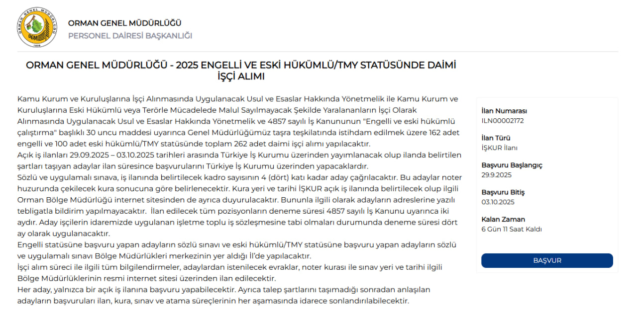 Orman Genel Müdürlüğü'nün daimi işçi alımı için belirlenen başvuru süreci oldukça kısa tutuldu. OGM personel alımı başvuruları 29 Eylül 2025 Pazartesi günü başlayacak, 3 Ekim 2025 Cuma günü sona erecek.