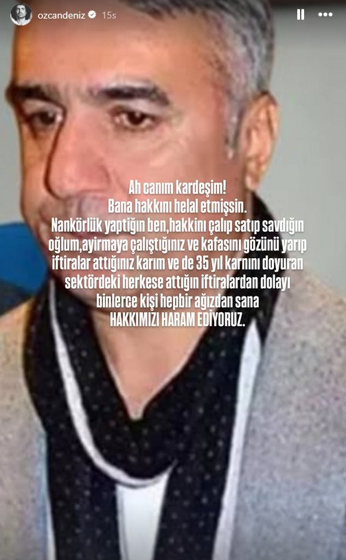 Ailesiyle yaşadığı problemlerle magazin manşetlerinden düşmeyen sanatçı Özcan Deniz, geçtiğimiz saatlerde sosyal medya hesabından yayınladığı paylaşımla gündeme geldi. Deniz, kendisine "Hakkımı helal ettim" diyen ağabeyi Ercan Deniz'e çok sert yanıt verdi.
