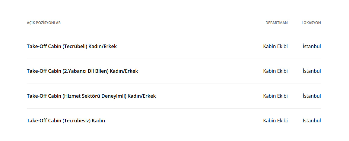 Henüz sektörde deneyimi bulunmayan, lisans mezunu ya da Sivil Havacılık Kabin Hizmetleri veya Sivil Hava Ulaştırma İşletmeciliği gibi belirli ön lisans bölümlerinden mezun kadın adaylar için de ilan kapsamında fırsatlar sunuluyor.