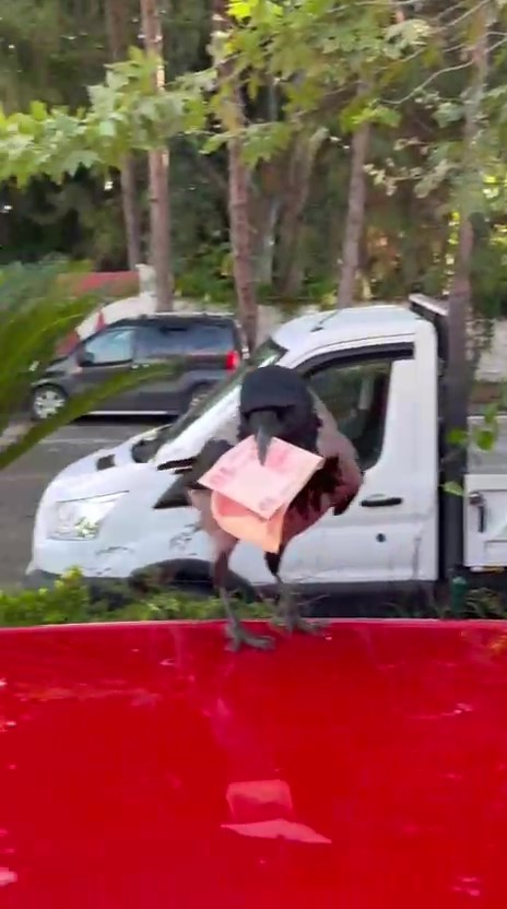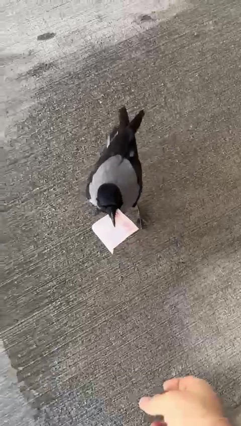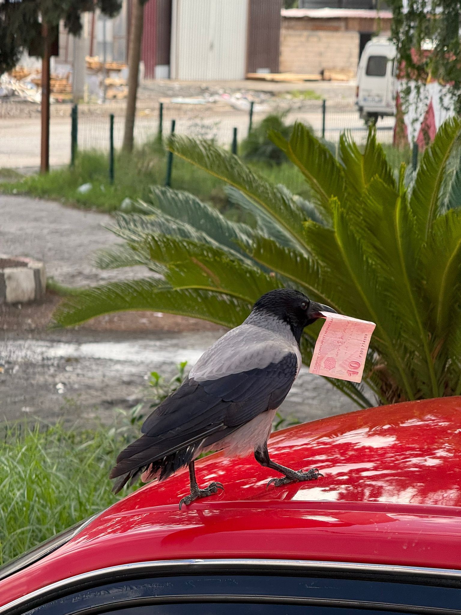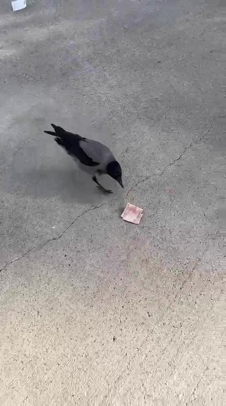 Geçtiğimiz günlerde kargayı önce poğaçayla besleyen Genç, ardından mizah amaçlı video çekmek için karganın önüne 10 TL bıraktı.