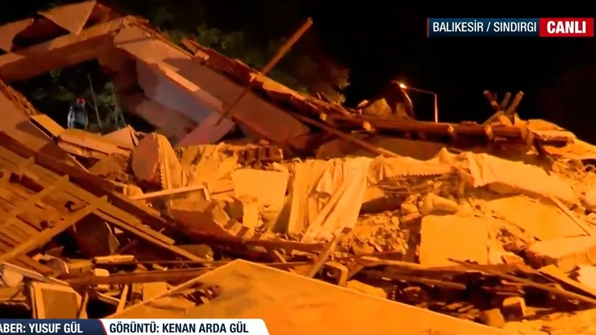 Balıkesir Sındırgı'da yıkılan 3 katlı bir binanın enkazı başında canlı yayına bağlanan A Haber Muhabiri Yusuf Gül, ekranlardan yıkımın boyutunu gözler önüne serdi. Gül, "Arama kurtarma çalışmaları yapılan bu binadan son mahsur kalan kişi de kurtarıldı. Yıkımın boyutunu ve evdeki eşyaları görüyoruz. Aynı zamanda binanın yanına park edilmiş bir araç vardı. Bu aracın da büyük hasar aldığını net bir şekilde görebiliyoruz. Meydana gelen depremde bina büyük bir gürültüyle yıkıldı. Ekipler sevk edildi ve mahsur kalan vatandaşları kurtarmak için zamana karşı bir yarış verildi." dedi.
