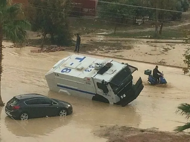 Merkez Toroslar ilçesine bağlı Güneykent Mahallesi'nde ise göreve giden bir zırhlı polis aracı TOMA da sel mağduru oldu.