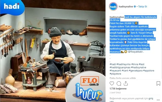 Hadi ipucu 15 Nisan yayına verildi. Canlı bilgi yarışması hadi bu akşam 20.30'da karşımızda olacak. Hadi bu akşam ayakkabının Türkçe'deki en eski karşılığını soruyor. Hadi bu akşam FLO'nun sponsorluğu ile gerçekleşecek ve tam 20 bin TL ödül verecek. Bu nedenle hadi ipucu sorusu oldukça yoğun şekilde aranıyor. Peki, Orta Asya'da kullanılan konçlu ayakkabıya verilen ad nedir? İşte 20.30 hadi...