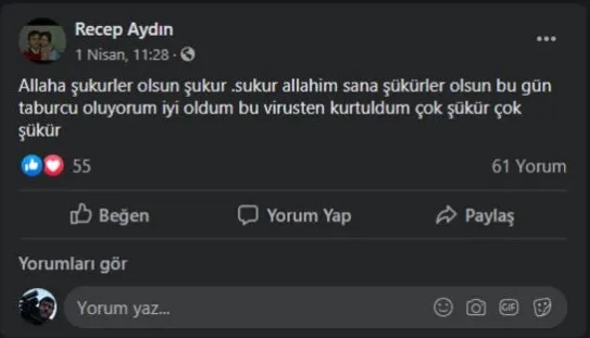 Aydın, bir başka paylaşımında ise "Allaha şükürler olsun şükür. Şükür Allah'ım sana, şükürler olsun. Bugün taburcu oluyorum. İyi oldum. Bu virüsten kurtuldum. Çok şükür, çok şükür" ifadelerini kullandı.