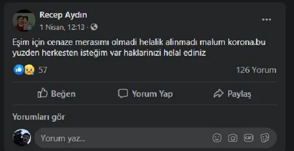 Hastalığı yenerek evinde karantinaya alınan Recep Aydın ise sosyal medya hesabından paylaşımlarda bulundu. Recep Aydın eşinin ölümünden bir gün sonra, "Eşim için cenaze namazı olmadı. Helallik alınmadı, malum korona. Bu yüzden herkesten isteğim var. Hakkınızı helal edin" dedi.