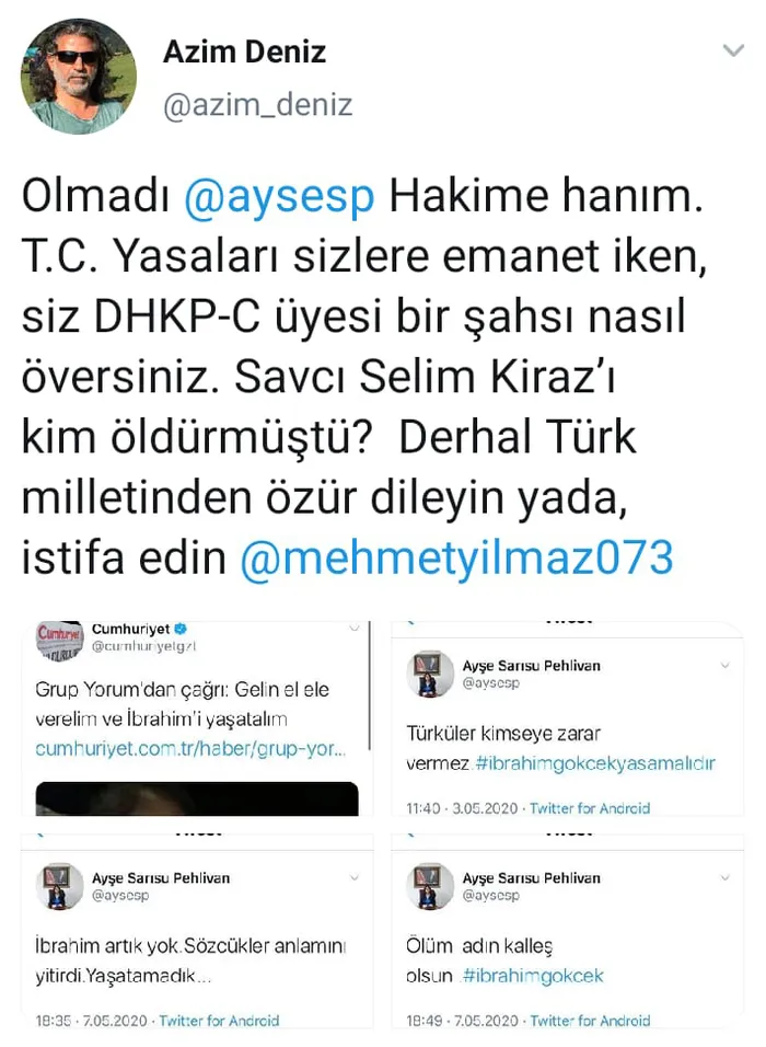 İzmir Karşıyaka Hakimi Ayşe Sarısu Pehlivan, DHKP-C sanığı olarak yargılandığı sırada örgüt talimatıyla açlık grevine başlayıp geçtiğimiz günlerde kaldırıldığı hastanede ölen İbrahim Gökçek’in ardından ağıtlar yaktı. Hâkim Pehlivan, Twitter hesabından İbrahim Gökçek ile ilgili skandal paylaşımlarda bulundu.