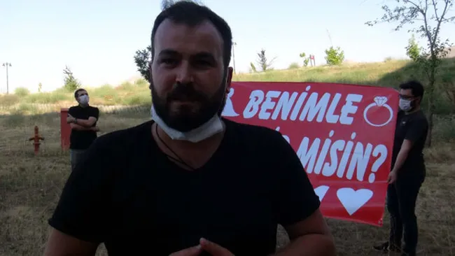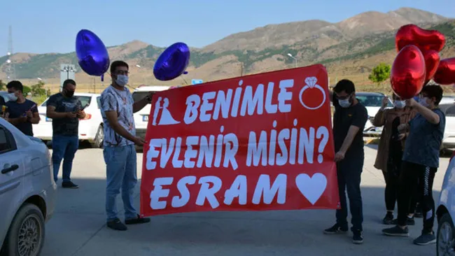 Bitlis'te yaşayan Sedat Akbay, kız arkadaşı Esra Akbay'a, 14 gündür koronavirüs tedavisi gördüğü hastane önünde, 'Benimle evlenir misin Esram' yazılı pankart açarak, evlilik teklifinde bulundu. Genç kız da kağıda, 'Evet' yazarak karşılık verdi.