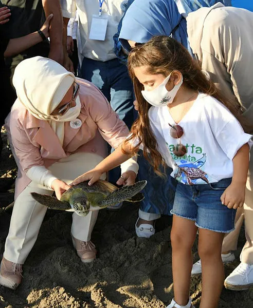 Cumhurbaşkanı Recep Tayyip Erdoğan'ın eşi Emine Erdoğan, Çevre ve Şehircilik Bakanı Murat Kurum ile birlikte Antalya’nın Kaş ilçesinde tedavisi tamamlanıp, takip için çip takılan 4 deniz kaplumbağasını denize uğurladığı törende çok güzel bir olaya şahitlik ettiklerini söyledi.