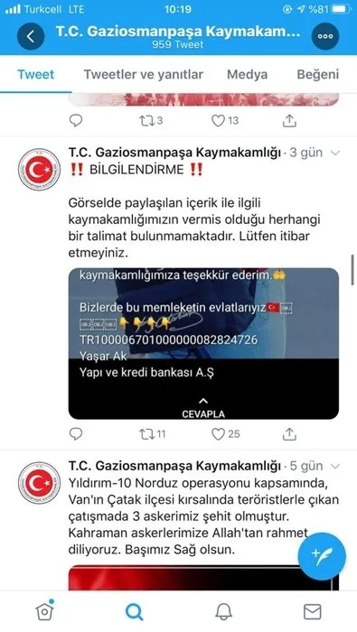 Sosyal medyada Gaziosmanpaşa Kaymakamlığı'ndan izin alarak yardım kampanyası yürüttüklerini iddia eden dolandırıcıları kaymakamlık fark etti. Gaziosmanpaşa Kaymakamı Numan Hatipoğlu, ' Maalesef kötü niyetli kişiler çeşitli şekillerde, vatandaşlarımızın iyi niyet duygularını istismar etmeye çalışmaktalar. Bunlardan bir kısmı da kaymakamlıkların, resmi kurumların ismini kullanarak dolandırma çabası gösteriyor' dedi.
