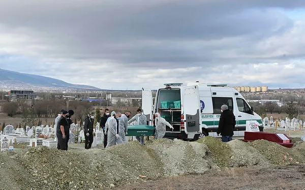 Kütahya'da koronavirüs nedeniyle hayatını kaybeden Serdar Mehmet Ay'ın cansız bedeni hastanedeki işlemlerimin ardından Kütahya Şehir Mezarlığı'na getirildi.