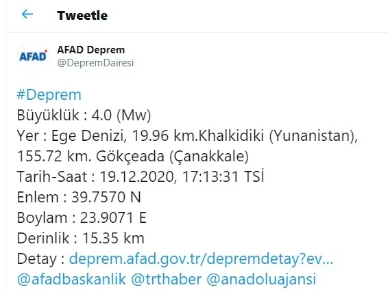 Depremin 15,35 kilometre derinlikte olduğu ve Çanakkale'nin Gökçeada ilçesine 155,72 kilometre yakınlıkta gerçekleştiği belirlendi.