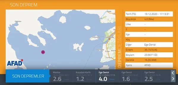 SON DAKİKA HABERİ: Afet ve Acil Durum Yönetimi Başkanlığının (AFAD) internet sitesinde yer alan bilgiye göre, saat 17.13'te Ege Denizi'nde 4 büyüklüğünde deprem kaydedildi.