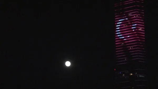 Bir binadan yansıtılan Türk bayrağı ve dolunayın akşam saatlerinde kaydedilen etkileyici anları görenleri adeta büyüledi.