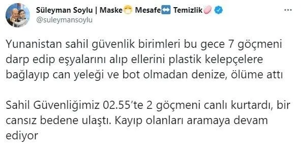 İçişleri Bakanı Süleyman Soylu da yaşanan felaketle ilgili sosyal medya hesabından açıklamalarda bulundu. Bakan Soylu, 'Yunanistan sahil güvenlik birimleri bu gece 7 göçmeni darp edip eşyalarını alıp ellerini plastik kelepçelere bağlayıp can yeleği ve bot olmadan denize, ölüme attı. Sahil Güvenliğimiz 02.55'te 2 göçmeni canlı kurtardı, bir cansız bedene ulaştı. Kayıp olanları aramaya devam ediyor' dedi.