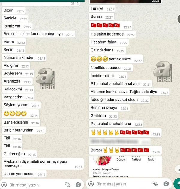 Son dakika haberine göre; İzmir’de Belarus asıllı avukat Maryia Konak, Adana’da yaşayan Mustafa U.’nun 6 aydır süren telefonla tacizleri üzerine suç duyurusunda bulundu. Konak, zanlının “Arkamda kapı gibi başsavcı var” dediğini anlattırken, tacizcinin WhatsApp mesajlarını paylaştı.