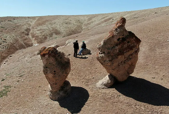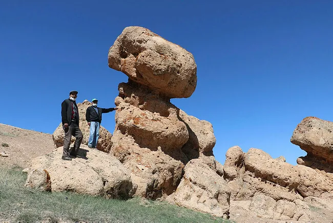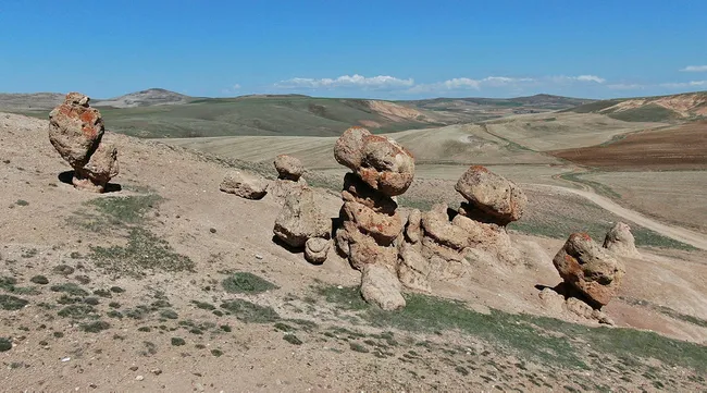 Boş arazide sadece bir bölgede bulunan ilginç kayalar, farklı kayaların destekleriyle ayakta duruyor. Görüntüleri kadar rivayetiyle de dikkat çeken kayalar görenlerin ilgisini çekiyor.