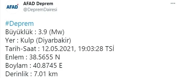 Son dakika: Diyarbakır'da 3.9 büyüklüğünde deprem | AFAD 2021 SON DEPREMLER