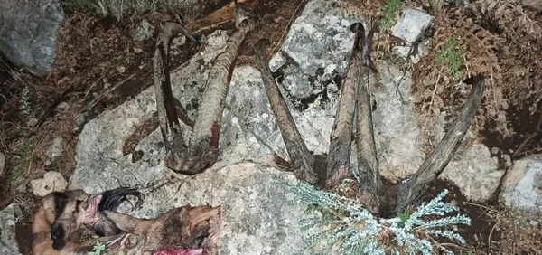 Şahısların ev ve müştemilatlarında yapılan aramada, evlerden birinin bahçesinde yaşları 3-4 arasında, yeni vurulmuş 3 adet yaban keçisi derisi, yüzülmüş kafaları, bu kafalara ait deriler, boynuzlar ile poşetlere konulmuş etleri bulundu.