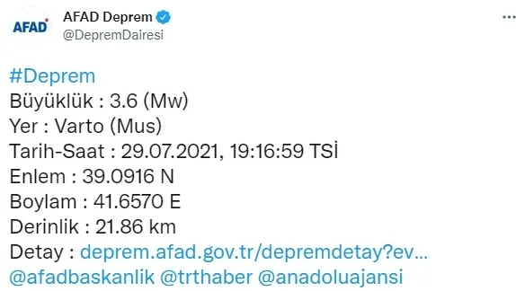 SON DAKİKA: Muş'un Varto ilçesinde saat 19:16'da 3,6'lik deprem meydana geldi.