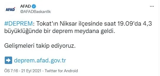 Tokat'ın Niksar ilçesinde 4,3 büyüklüğünde deprem meydana geldi. Afet ve Acil Durum Yönetimi Başkanlığının internet sitesinde yer alan bilgiye göre, deprem, saat 19.09'da ve 14,34 kilometre derinlikte gerçekleşti.