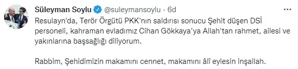 İçişleri Bakanı Süleyman Soylu, "Resulayn'da, Terör Örgütü PKK'nın saldırısı sonucu Şehit düşen DSİ personeli, kahraman evladımız Cihan Gökkaya'ya Allah'tan rahmet, ailesi ve yakınlarına başsağlığı diliyorum. Rabbim, Şehidimizin makamını cennet, makamını âlî eylesin inşallah." paylaşımında bulundu.