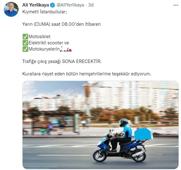 İstanbul Valisi Ali Yerlikaya, "Yarın saat 08.00'den itibaren motosiklet, elektrikli scooter ve motokuryelerin trafiğe çıkış yasağı sona erecektir." dedi.